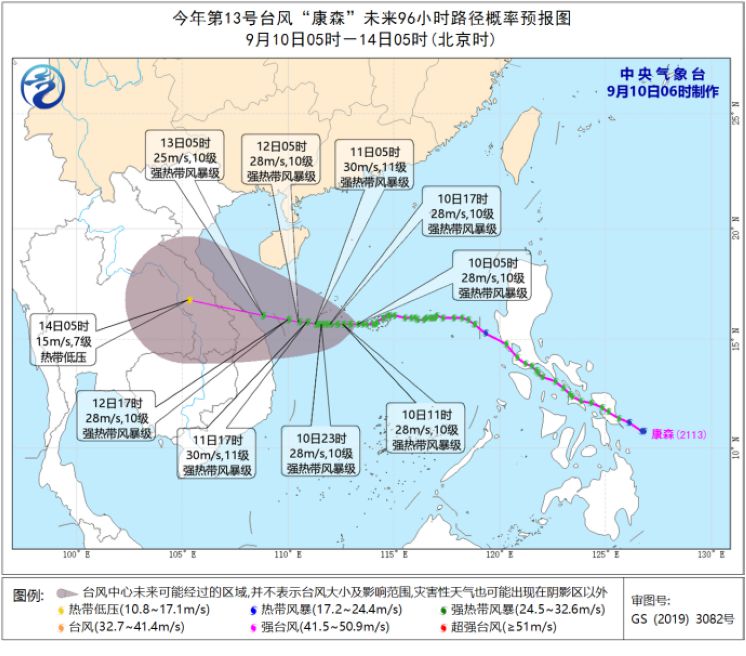 It is estimated that "Kang Sen" will move westward at a speed of 10-15km/h, with little change or slight increase in intensity, and will pass through the south of Xisha Islands before approaching the coastal area in central Vietnam. From 08: 00 on the 10th to 08: 00 on the 11th, there will be 6-7 winds in the western South China Sea, Xisha Islands, zhongsha islands, Nansha Islands and the southern coast of Hainan Island, among which the winds in the southern Xisha Islands and the western zhongsha islands are 8-9, and the winds in the nearby waters passing by the Kang Sen Center are 10-11, with gusts of 12-13. There will be heavy rains in most parts of Hainan Island, Xisha Islands and zhongsha islands, with heavy rains (100-180 mm) in southern Hainan Island and parts of Xisha Islands. The Central Meteorological Observatory continued to issue a blue typhoon warning at 06: 00 on September 10th (see Figure 1).